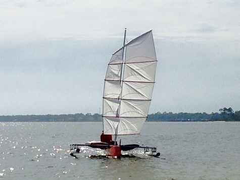 The prototype Little Tri used a Sunfish rig. While that works, I wanted something different and easier to single-hand while sailing in 20+ MPH winds normally found on the Texas 200 event. Junk rigs are known to be easy to handle with quick reefing and other advantages over conventional sloop rigs. The split junk rig I selected addresses the shortcomings of normal junk rigs while keeping the many advantages.