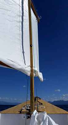 I am quite a project-oriented person. If I commit to something sensible, I’ll generally see it all the way through. I don’t always do a particularly good job, but I do finish. And so it was with the PDR. Almost every step along the way was a learning experience – from buying the plywood (heavy, and more expensive than I thought, and very tricky to transport) – to cutting the plywood (terrible job, uneven and wobbly) and every step in between. Still, I had fun, and the sense of having created something is awesome.  Das Boot first sailed in some rather-too-windy conditions. It didn’t have decks or braces, it flexed quite badly, the leg-o-mutton sail couldn’t be reefed easily. I blasted up and down the lake for half an hour until my nerves were too jangled, then aimed back to shore. Later that month, I took Das Boot back to my garage and retrofitted it with decks, bracing, and epoxy taped seams.