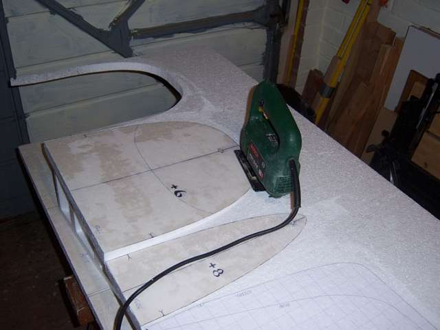 Glue Paper patterns onto 1 inch thick polystyrene. Then cut out with jig saw. (Glue paper on the reverse side as well if you don’t want these station moulds to warp as the glue dries.)