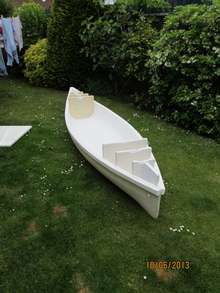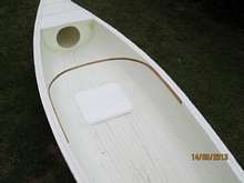 Fore and aft decks added (they stiffened up the boat wonderfully). A ¼ by ½ inch strip of oak (recovered from old kitchen cupboard doors) was bent using a hot air gun and glued in place to act as a backrest.