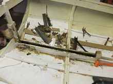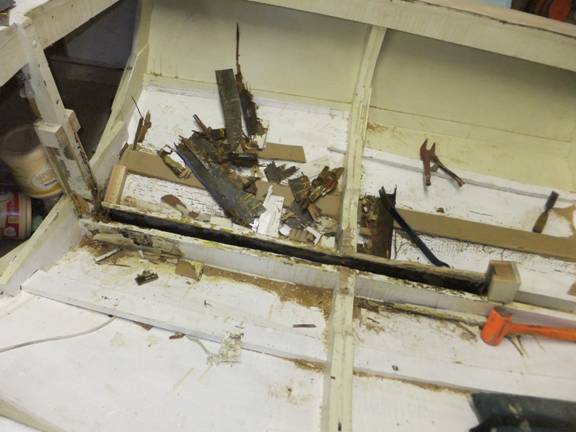 Funny, sorta’.  The innards of that mahogany stringer, lovingly mortised into those mahogany frames, and lovingly copper nailed through the quarter-inch marine ply skin all those decades ago; actually LOOKED like shredded wheat.  WET, shredded wheat.