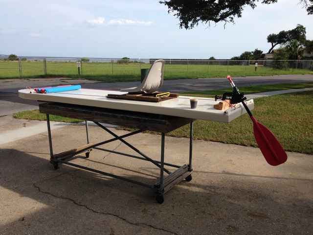 The Board was now ready for sea trials and I may have had 12 or 13 hours invested. I did use the lanyard through and between the PVC in the front and aft ending up with a line to grab and tie stuff to. I slipped some line through some pieces of a pool-noodle and tied them between the 2 fore and aft tie-down lines. This provided adjustable pads to use when car topping the boards. Just slide them to the position needed and you have instant padding. For sea trials I used a temporary tracking oar I had that was made from a trolling motor mount and a plastic paddle. I also fashioned a removable seat so I could try paddling it like a kayak as well as standing up. I made an oar for standing up and took along a canoe paddle for sitting down. I fashioned a seat that simply sat on a welcome mat on the board making it easy to install and remove when needed. The welcome mat also served as the non-skid when standing. I used a small pieces of line and poked a hole in the mat to tie it to the tie down lines to keep it with the board in case I fell off.