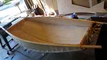 When the plans arrived, I started immediately. I got the plywood home on the top of my SUV, somewhat against relevant vehicle code. I had it marked out within the half hour, did a terrible job with the jigsaw holding the sheets on a thigh, at one point resting a lose end on my forehead. Skill – epoxy cures all – a few little wavy bits don’t matter (see why I didn’t tackle the lapstrake now?). Within the first evening I had all the major panels cut out and the framing on.