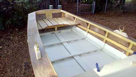 I got out and installed the aft seat and the rowing thwart as well. Also fitted the Oar Lock Risers which keep the loom of the oar from hitting the Inboard edges of the decks on the return stroke.