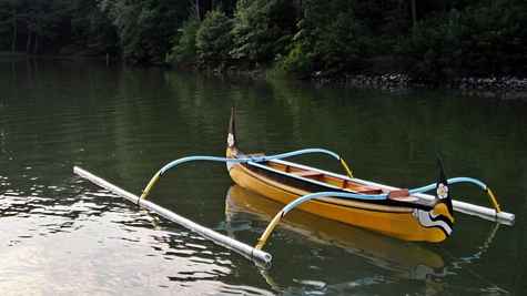 My version of a Perahu Katir - a style of Jukung from NE Java. Google the boats of Pasir Putih for pics of the originals. Mine is smaller, and skin-on-frame rather than dug out of a log. The outriggers, however, are of giant bamboo, as is traditional. Turns out there's a patch of it here.