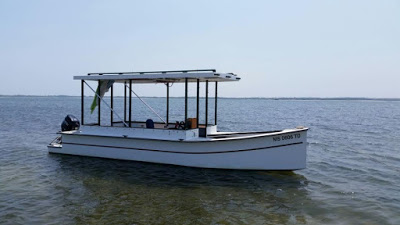 I built Bantam and Grinder, both modified Phil Bolger designs. Grinder turned out very well, but I thought I could do better. My idea was to build a boat similar to Grinder, but much lighter, with a different profile and a bit longer cabin. Since a flat bottom boat gains efficiency as it loses weight, I wanted to try a smaller engine that needed less battery, all Okume construction, a laminated 3/4" hull, and get rid of the heavy shoe Phil had on the clam skiff. I changed the sheer line to something I liked, eliminated the raised coaming of Grinder, and added an extended gunwale to stop spray and provide a walkway and seating all around the boat. The construction pretty much follows the method I used on Grinder.